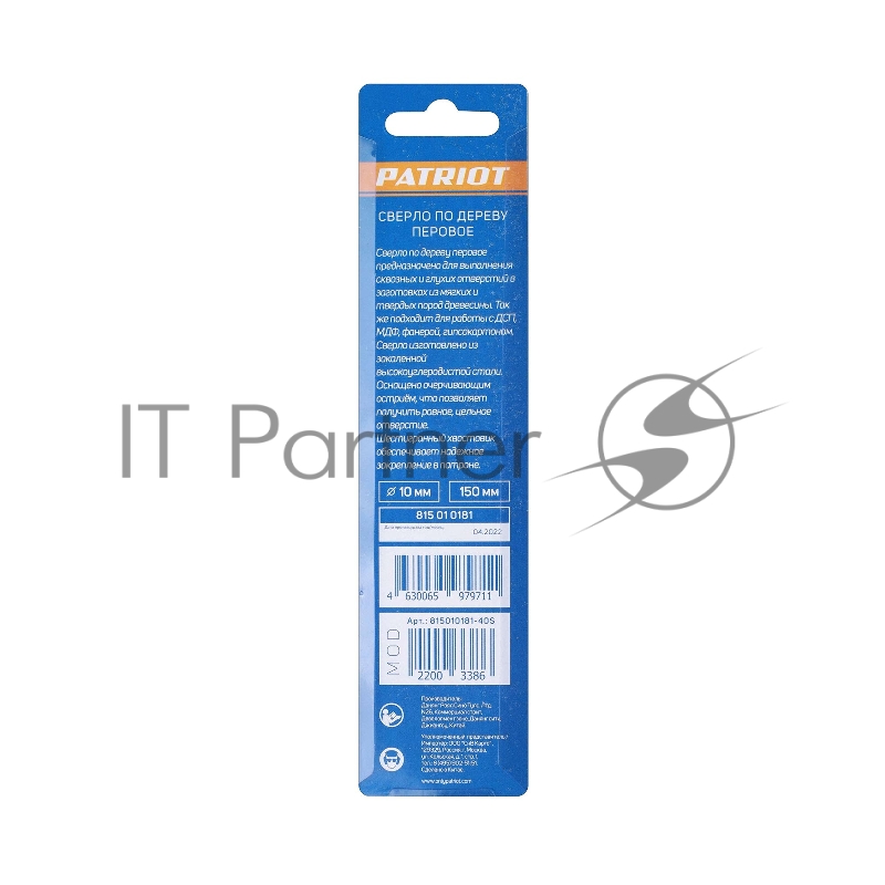 Сверло PATRIOT по дереву перовое 10мм х 150 мм, 1 шт в блистере