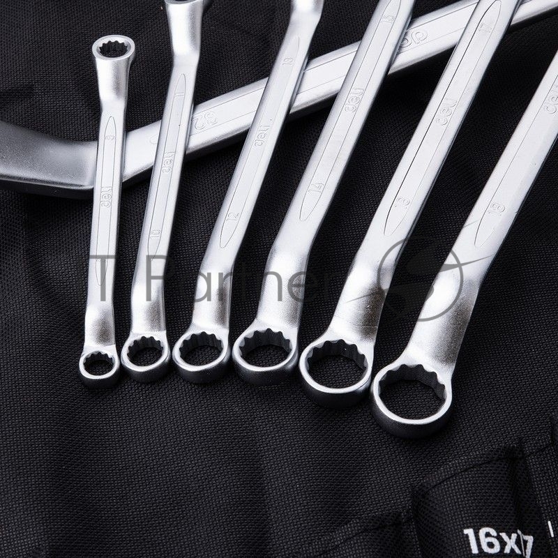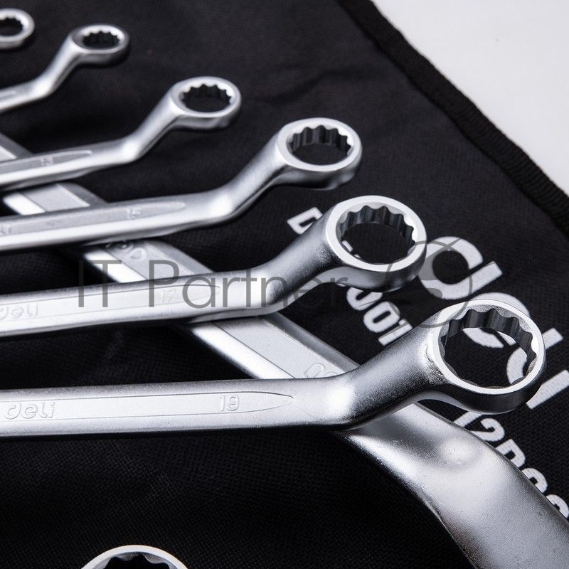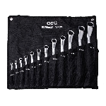 Набор накидных изогнутых гаечных ключей 12 шт Deli DL150012A Спецификация: 6x7, 8x9, 10x11, 12x13, 14x15, 16x17, 18x19, 20x22, 21х23, 24х27, 25х28, 30х32. Матовая хромированная поверхность. Чехол из ткани Oxford.