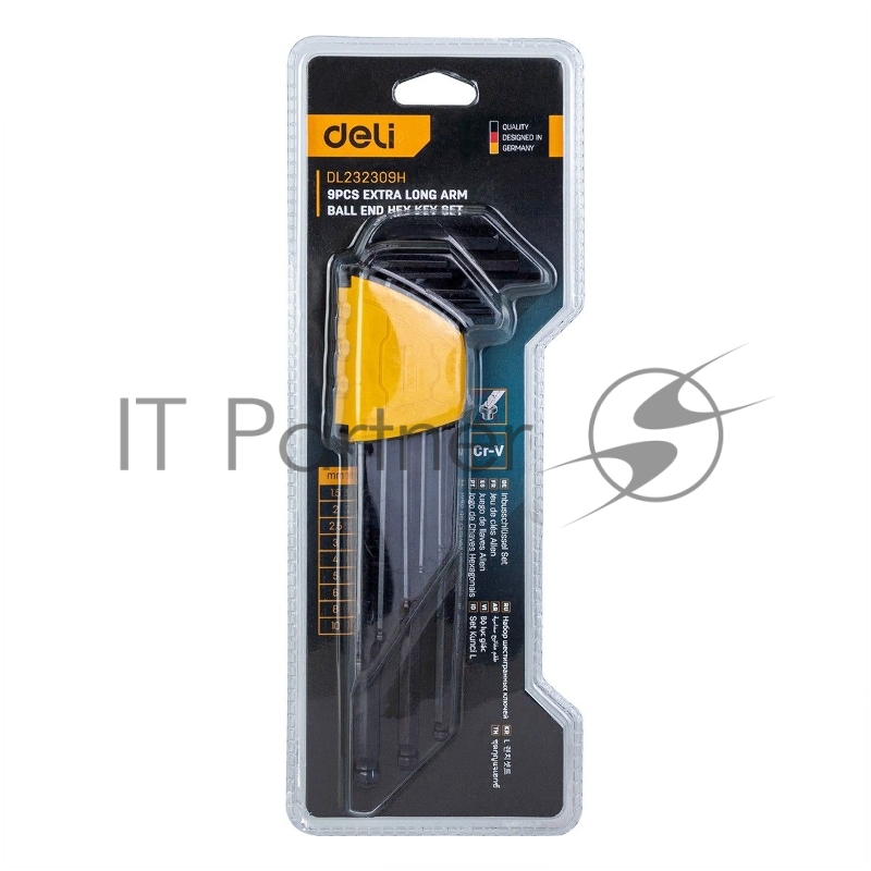 Набор шестигранных ключей с шаром сверхдлинных Deli DL232309H 9 шт Материал CR-V. Спецификация: 1,5,2,2,5,3,4,5,6,8,10мм, пластиковый держатель