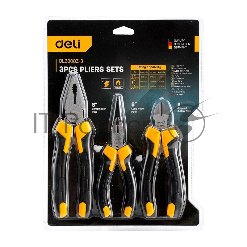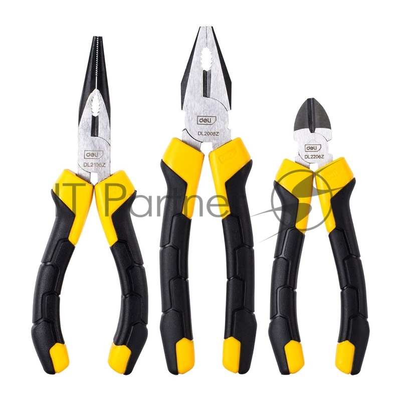 Набор плоскогубцев Deli DL2008Z-3 8-дюймовые комбинированные плоскогубцы, 6-дюймовые длинногубцы, 6-дюймовые диагональные плоскогубцы. Высокоуглеродистая сталь. Двухкомпонентная ручка