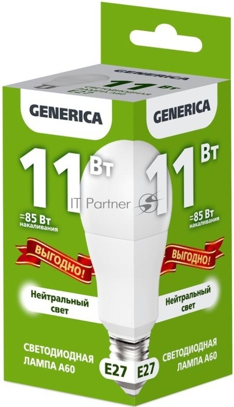Лампа светодиодная A60 11Вт грушевидная 4000К E27 230В промо GENERICA LL-A60-11-230-40-E27-G