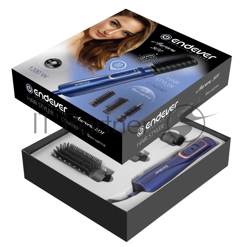 Стайлер Endever Aurora-501 Мощность 1200 Вт, 3 сменных насадки, 3 режима работы, кнопка холодного обдува, цвет синий/золотой