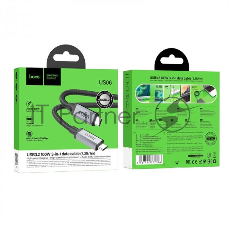 Кабель Type-C HOCO US06 USB3.2 20Gbps, 100W, 5.0А, длина 1.0м, черный