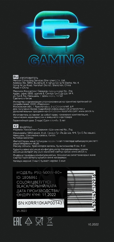 Блок питания Оклик ATX 500W GMNG PSU-500W-80+ 80 PLUS WHITE (24+4+4pin) APFC 120mm fan 5xSATA RTL