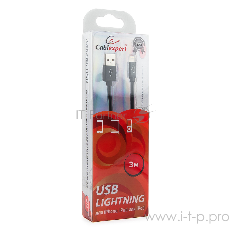 Кабель Cablexpert Кабель для Apple CC-S-APUSB01Bk-3M, AM/Lightning, серия Silver, длина 3м, черный, блистер
