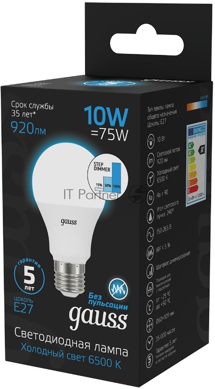 Лампа светодиодная Gauss 102502310-S 10Вт цок.:E27 груша 220B 6500K св.свеч.бел.хол. (упак.:10шт)