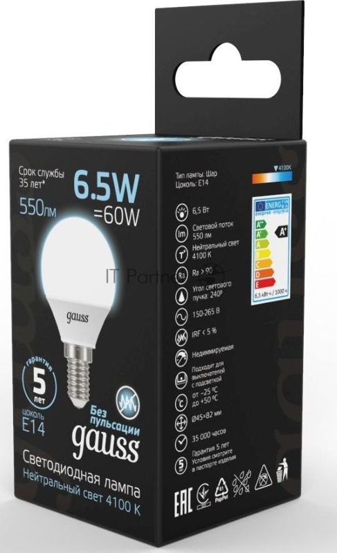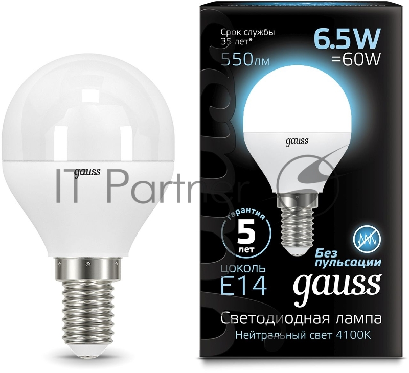 Лампа светодиодная Gauss 6.5Вт цок.:E14 шар 220B 4100K св.свеч.бел.нейт. (упак.:10шт) (105101207)