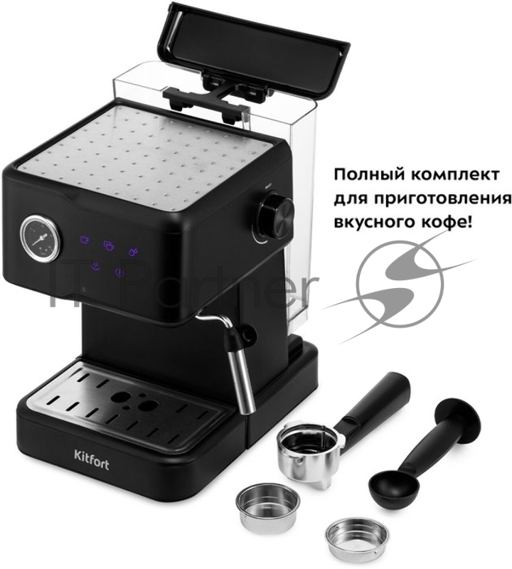 Кофеварка рожковая, Kitfort, КТ-7124, Объем резервуара для воды 1.5 л, Мощность 950 Вт, Тип нагревателя бойлер, Давление15 Бар, Используемый кофе молотый, Цвет черный