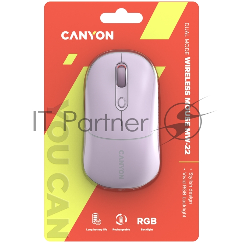Мышь CANYON MW-22, 2 in 1 Wireless optical mouse with 4 buttons,Silent switch for right/left keys,DPI 800/1200/1600, 2 mode(BT/ 2.4GHz), 650mAh Li-poly battery,RGB backlight,Pearl rose, cable length 0.8m, 110*62*34.2mm, 0.085kg