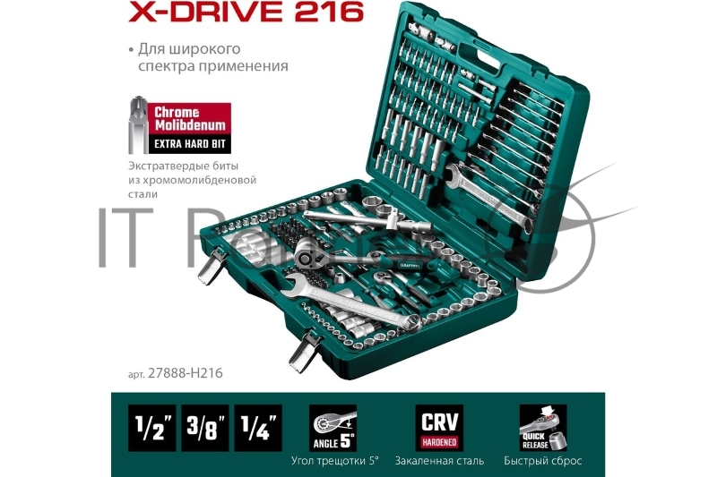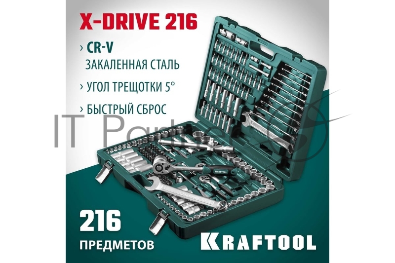 Набор KRAFTOOL X Drive, 216 предм., (1/2″+3/8″+1/4″), Универсальный набор инструмента (27888-H216)