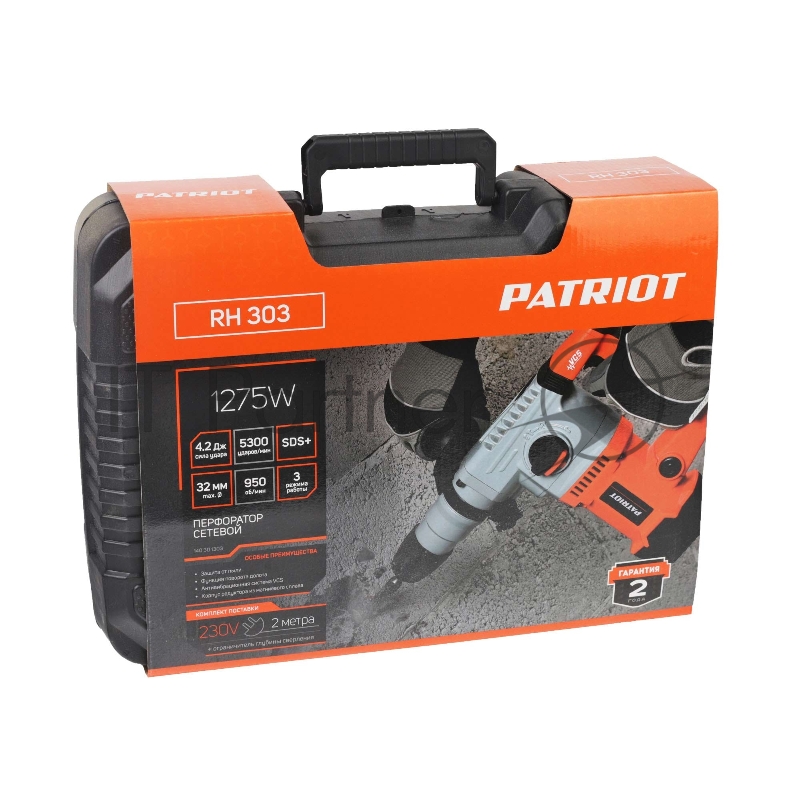 Перфоратор PATRIOT RH 303, SDS+, мощность 1275 Вт, 4.2 Дж, 3 режима работы, макс.диаметр 26мм, глубиномер, кейс