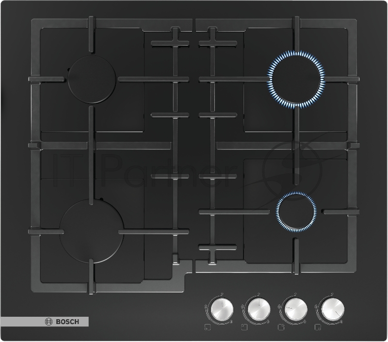 Serie 4, газовая варочная панель, 60см, закаленное стекло, черный, 4 конфорки,1 конфорка повышенной мощности, индивидуальные чугунные решетки, газ-контроль, автоматический электроподжиг, сделано в Испании