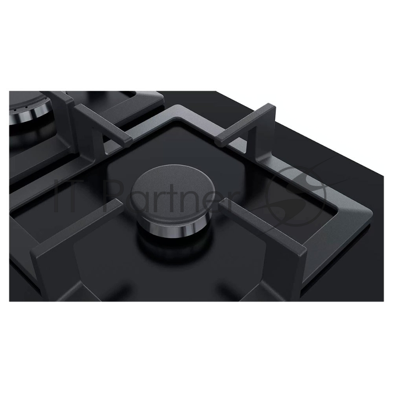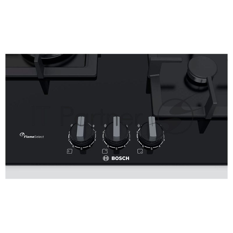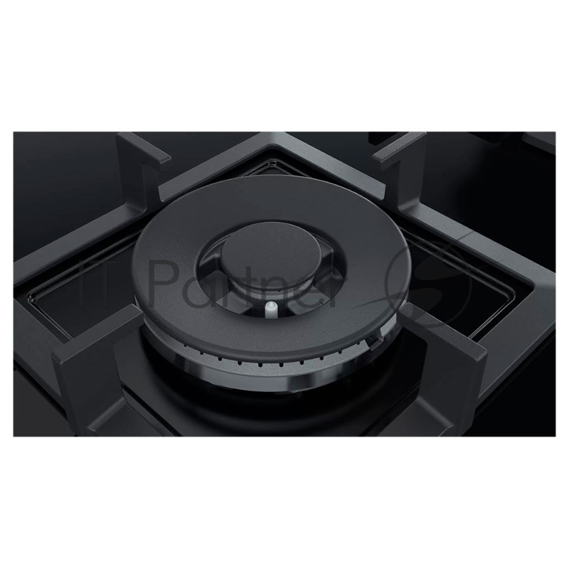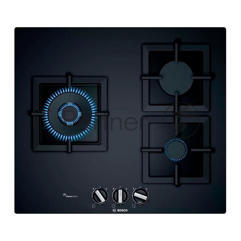 Serie 6, газовая варочная панель, 60см,3 конфорки,закаленное стекло, черная,1 WOK-конфорка c 2 контурами пламени, FlameSelect,чугунные решетки, газ-контроль, автоматический электроподжиг, сделано в Испании
