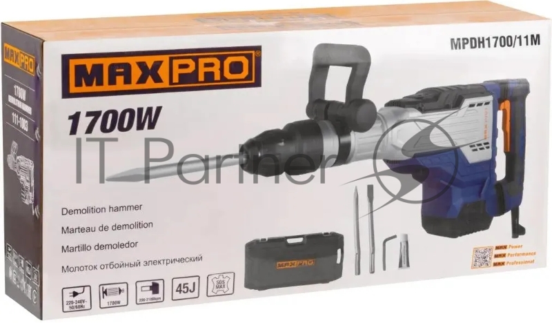 Молоток отбойный MAX-PRO MPDH1700/11M электрический 1700 Вт, 200-2100 уд/мин, 45 Дж, SDS-MAX, 11,5 кг, резиновый кабель, дополнительные щетки, кейс