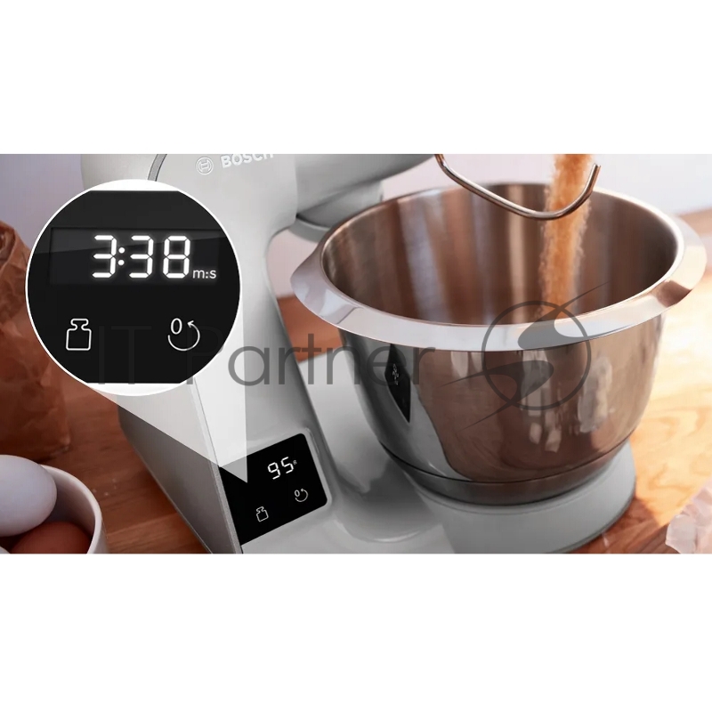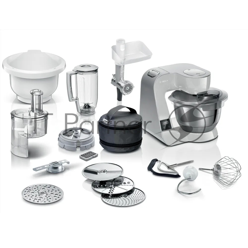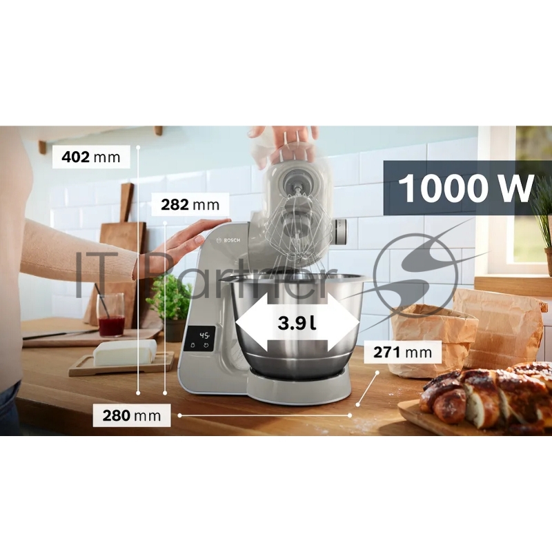 Кухонный комбайн Bosch/ Кухонный комбайн Bosch, мощность 1000 Вт, плавный пуск, 7 скоростей, импульсный режим, объем чаши 3.9 л, планетарное вращение, встроенные весы, встроенный таймер, крюк для теста, венчик для взбивания, венчик для замешивания,