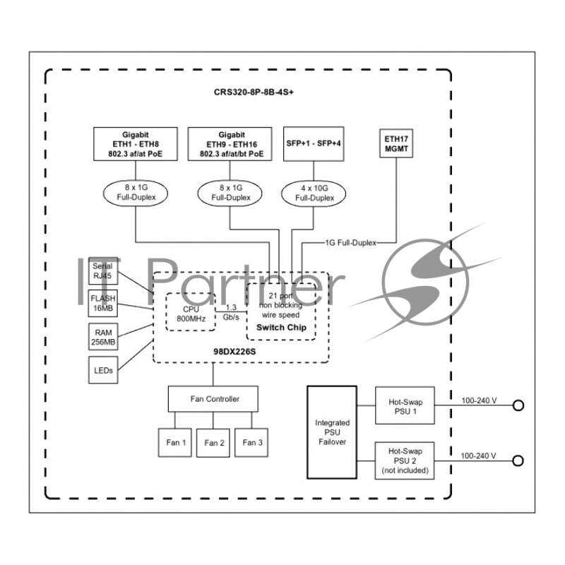 Коммутатор Mikrotik CRS320-8P-8B-4S+RM Cloud Router Switch with dual-core 800 MHz CPU, 256 MB RAM, 98DX226S switch chip, 17 x Gigabit Eth ports (8 x 802.3af/at, 8 x 802.3bt PoE-out), 4 x 10G SFP+ ports, RouterOS L5, 1U rackmount enclosure, 600W PSU