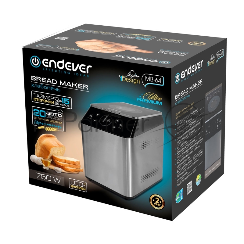 Хлебопечь электрическая Endever Skyline MB-64, стальной/черный, мощность 750 Вт, LСD дисплей, вес выпечки 750/1000/1250г,20 автопрограмм, 1 шт/уп.