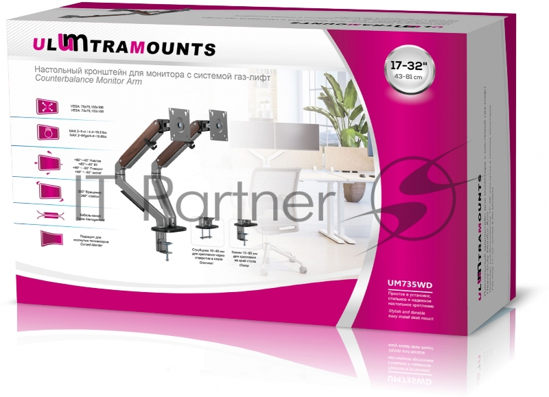 Кронштейн для мониторов Ultramounts UM735WD серый/коричневый 17-27 макс.7кг крепление к столешнице поворот и наклон