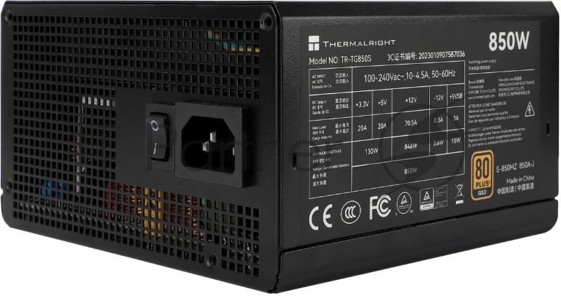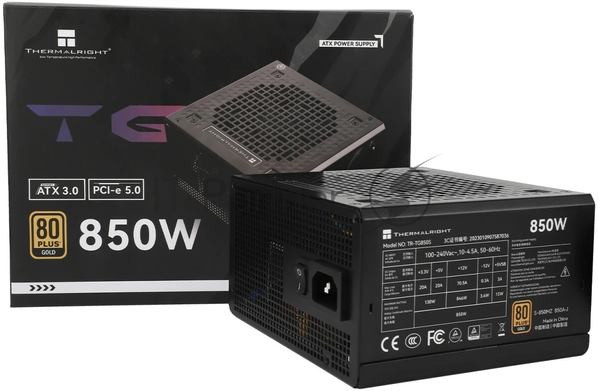 Блок питания Thermalright, 850W 80+ Gold (ATX, 3.0, PCIe 5.0, Non-modular, 1x24(20+4)pin, 1xCPU 8(4+4)pin, 2xPCIe*2 8(6+2)pin, 5xSATA3, 1x12+4pin (12VHPWR PCIe 5.0 12+4pin 600mm), 3xMOLEX4pin, Active, 120x120mm, 150x140x86mm, APFC, black)