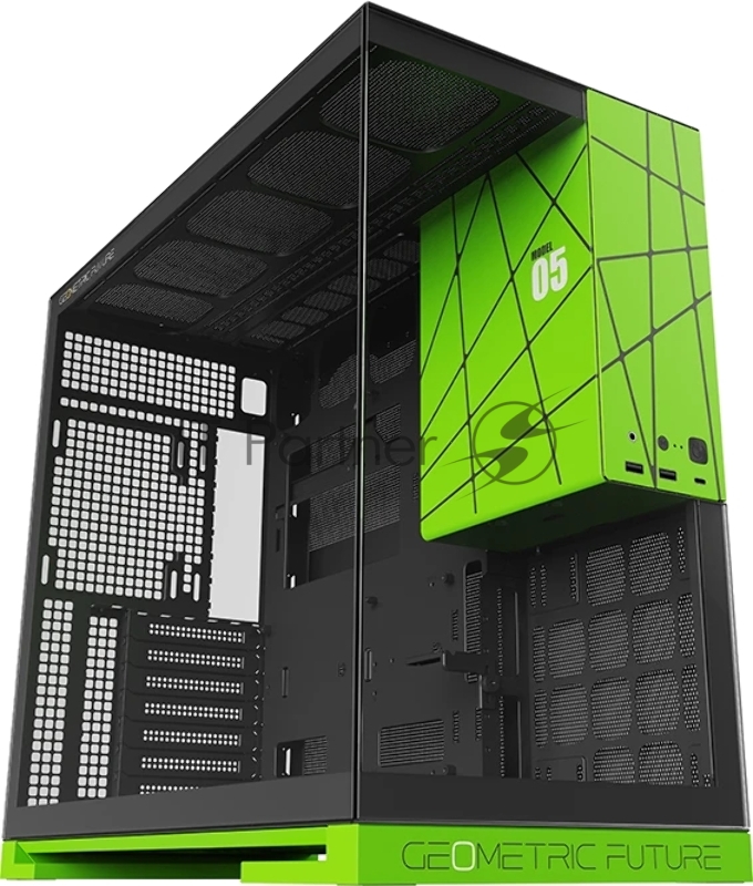 Корпус ПК без блока питания/ Case Geometric Future Model 5 NV Style, Midi-Tower, TG, no fans, 2xUSB-A 3.0, 1xUSB 3.2 Type-C, E-ATX, ATX, mATX, mITX Black/Green