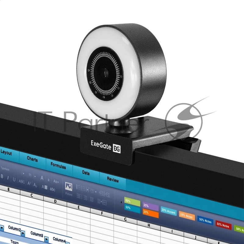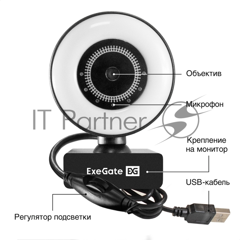 Веб-камера с подсветкой ExeGate eStudio EW-721 2K AF (5Мп, 2560х1440, 1440P, 30fps, автоматический фокус, подсветка, 4-линзовый объектив, стерео микрофон с шумоподавлением, универсальное крепление, отверстие под штатив, USB, кабель 1,5 м, Windows® 7/