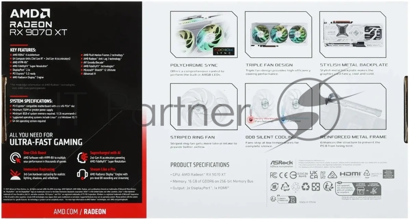 Видеокарта Asrock PCI-E 5.0 RX9070XT SL 16G AMD Radeon RX 9070XT 16Gb 256bit GDDR6 2400/20000 HDMIx1 DPx3 HDCP Ret