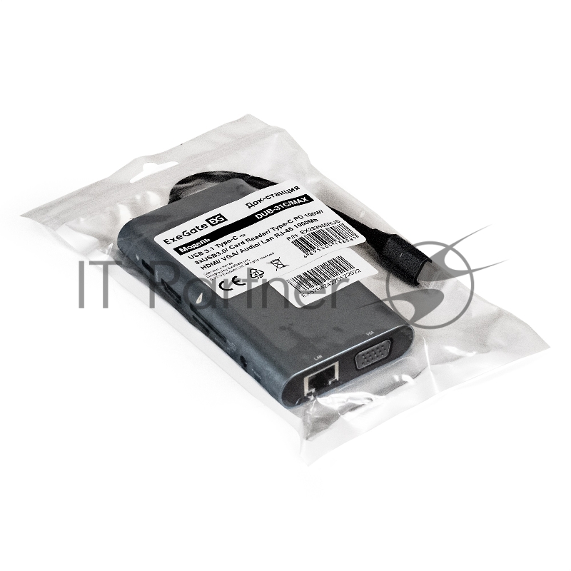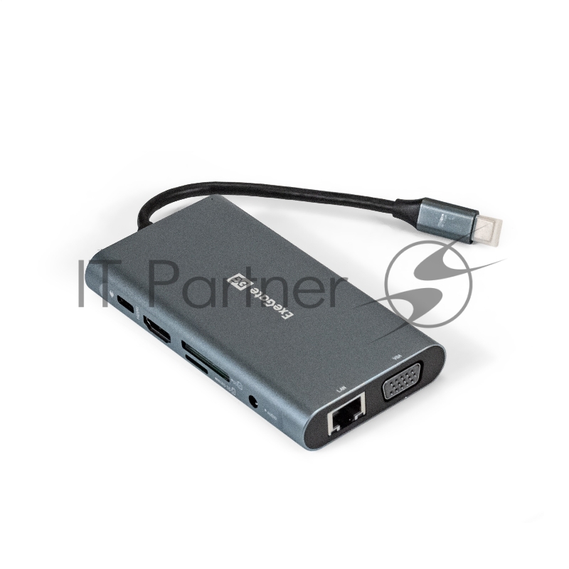 USB-концентратор ExeGate EX293985RUS DUB-31C/MAX (кабель-адаптер USB Type-C --> 3xUSB3.0 + Card Reader + PD 100W + HDMI 4K@30Hz + VGA + Audio + Lan RJ45 10/100/1000Mb, Plug&Play, серый)