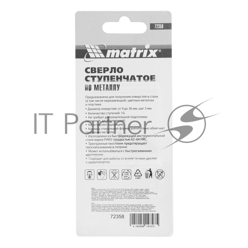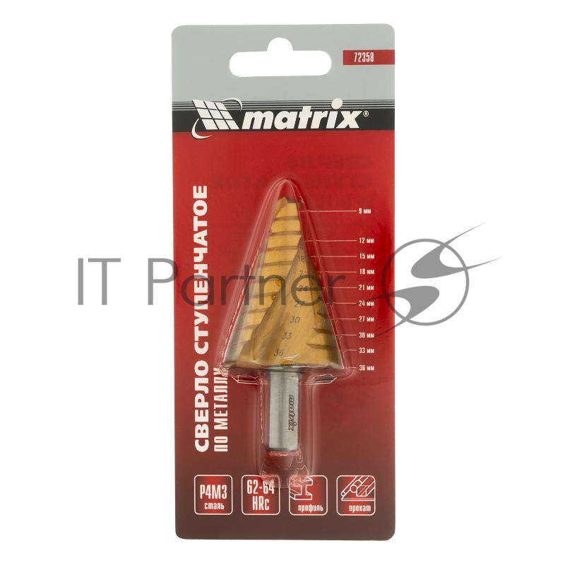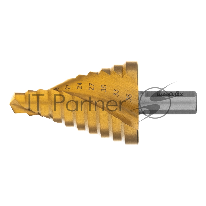 Сверло MATRIX 72358 ступенчатое 9-12-15-18-21-24-27-30-33-36мм hss спиральный профиль шестигранный