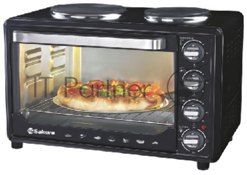 Мини-печь SAKURA SA-7001HBK 35л, 3200Вт, духовка 1600Вт, конфорки 185мм+155мм (1000Вт+600Вт), механ.управление, 3 режима работы духовки (верх, низ, верх+низ), раздельная регулировка температуры духовки и конфорок, комплектация - металлическая решетка