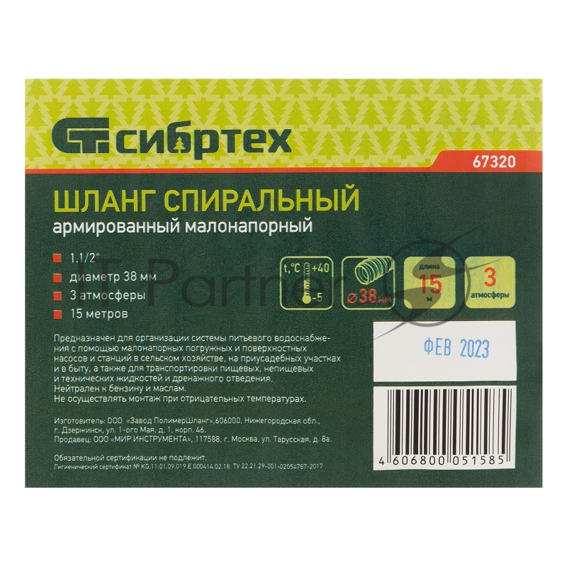 Шланг спиральный армированный малонапорный, Ф-38 мм, 3 атм., 15 метров// Сибртех