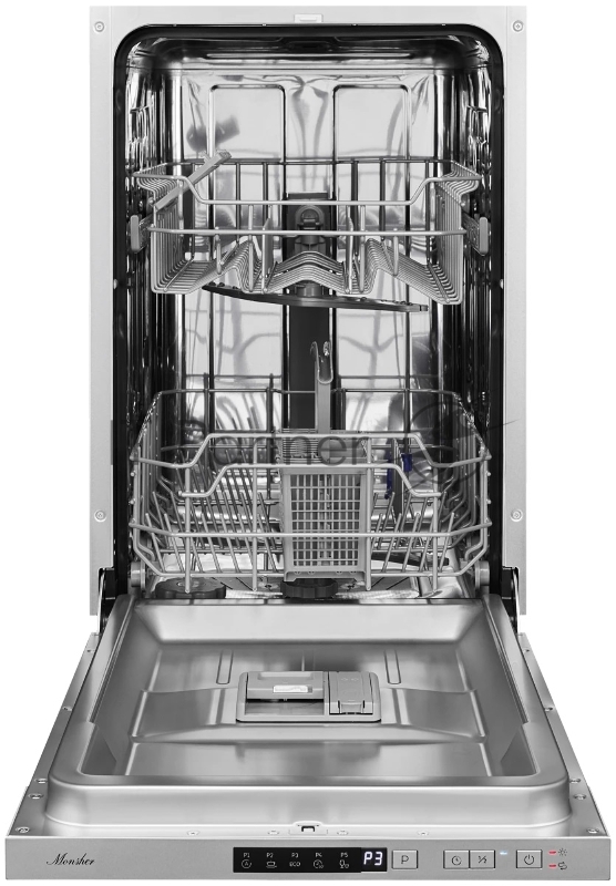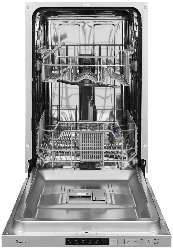 Встраиваемая посудомоечная машина MONSHER MD 4501полностью встраиваемая, ширина 45 см, Количество корзин: 3, 9 комплектов посуды, Кнопочное управление, Отсрочка старта 1-24 часов, 5 программ: Авто. Интенсивная, ЭКО, 90 мин, Быстрая, Половинная загру