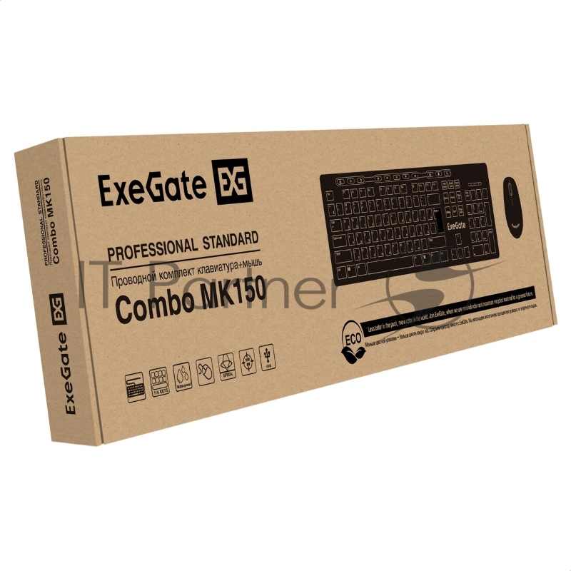 Комплект ExeGate Professional Standard Combo MK150 (клавиатура мультимедийная влагозащищенная 116кл. + мышь оптическая 1200dpi, 3 кнопки и колесо прокрутки, длина кабелей 1,5м USB, черный, RTL)