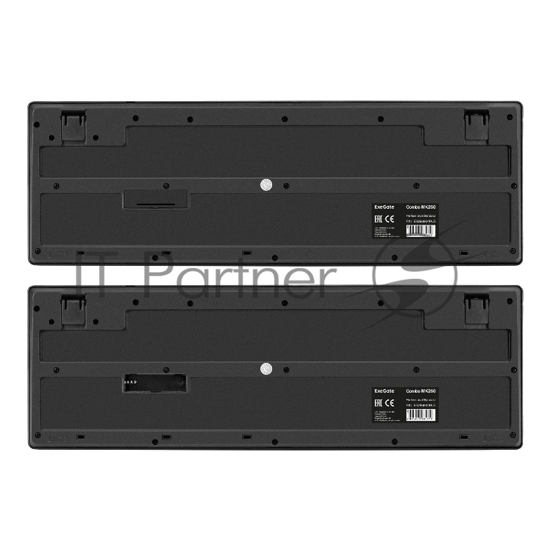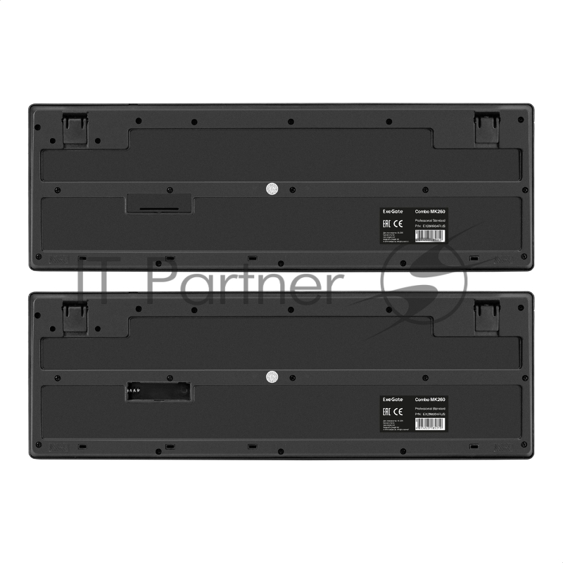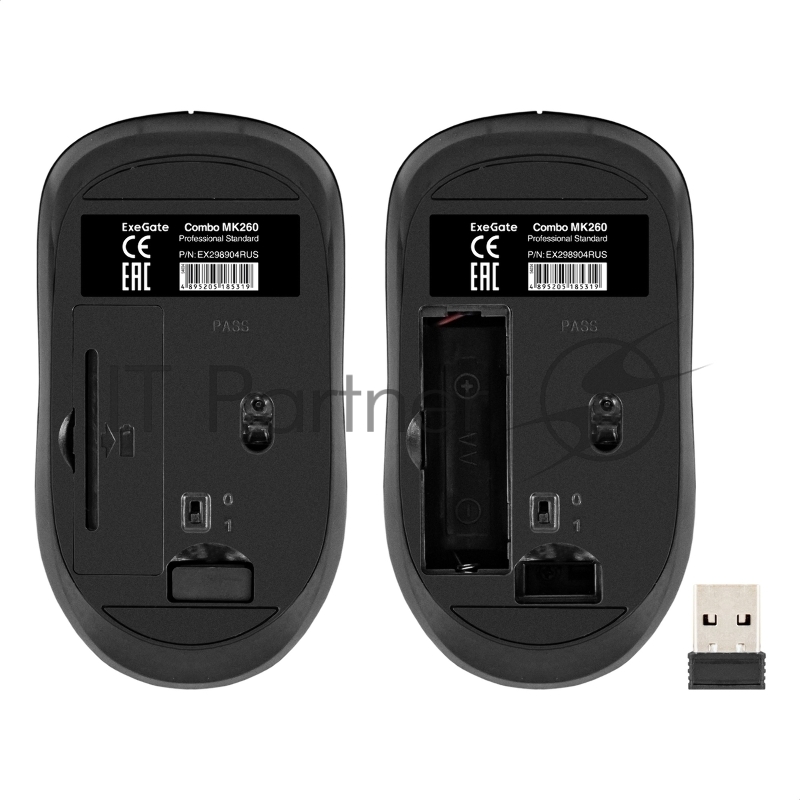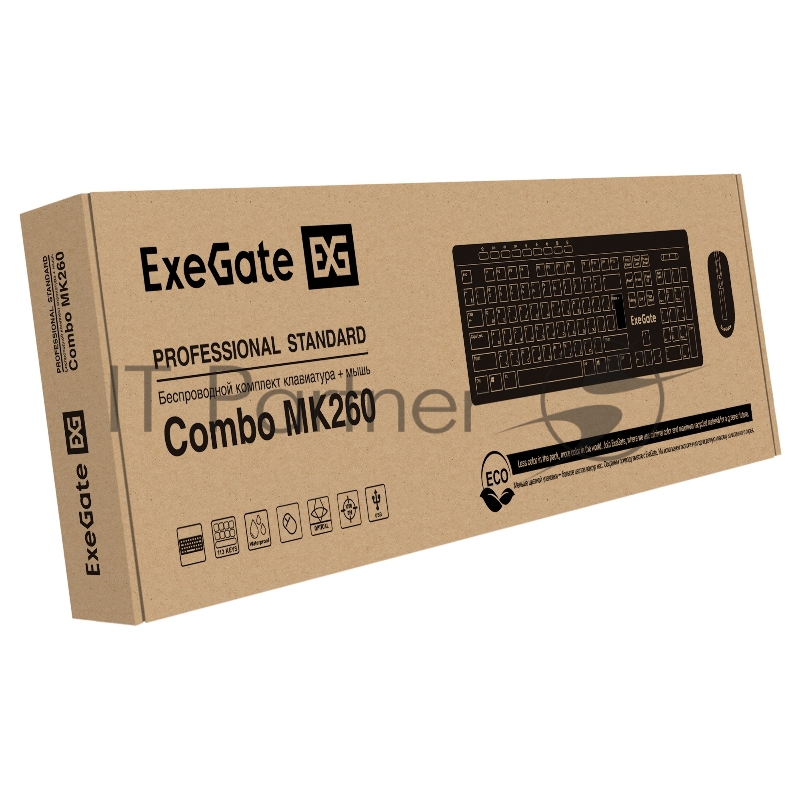 Комплект беспроводной ExeGate Professional Standard Combo MK260 (клавиатура мультимедийная полноразмерная влагозащищенная 113кл. + мышь оптическая 1200dpi, 4 кнопки и колесо прокрутки USB, радиоканал 2,4 ГГц, радиус действия до 10м, черный, RTL)