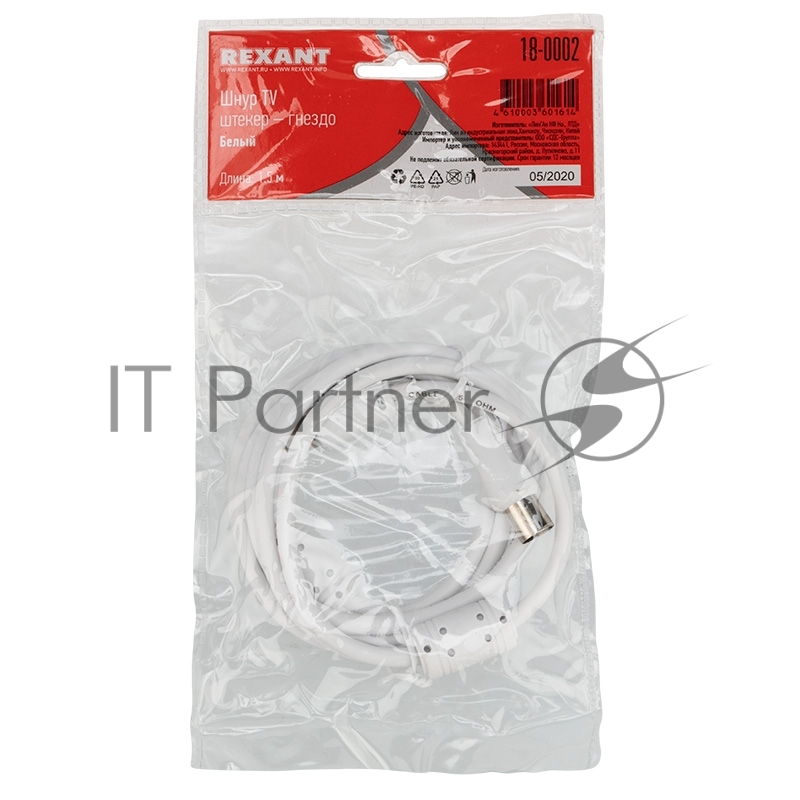 Шнур ТВ гнездо - ТВ штекер, длина 1,5 метра, белый Rexant