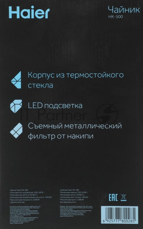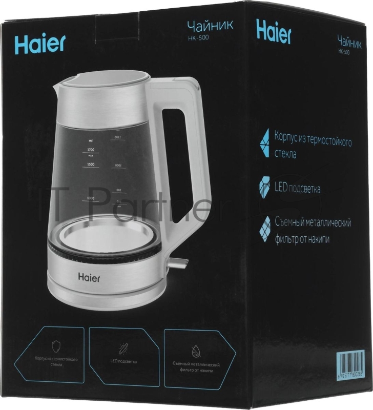 Чайник электрический Haier HK-500 1.7л. 2200Вт серый/белый корпус: стекло/пластик (TD0029955RU)
