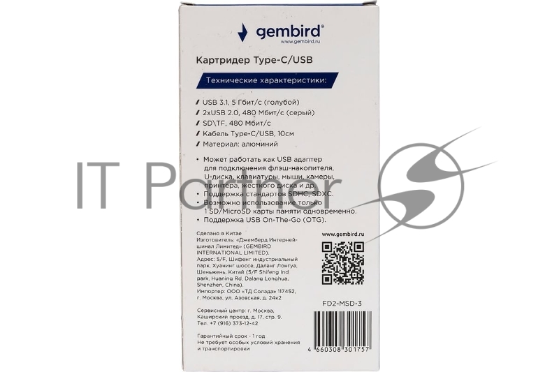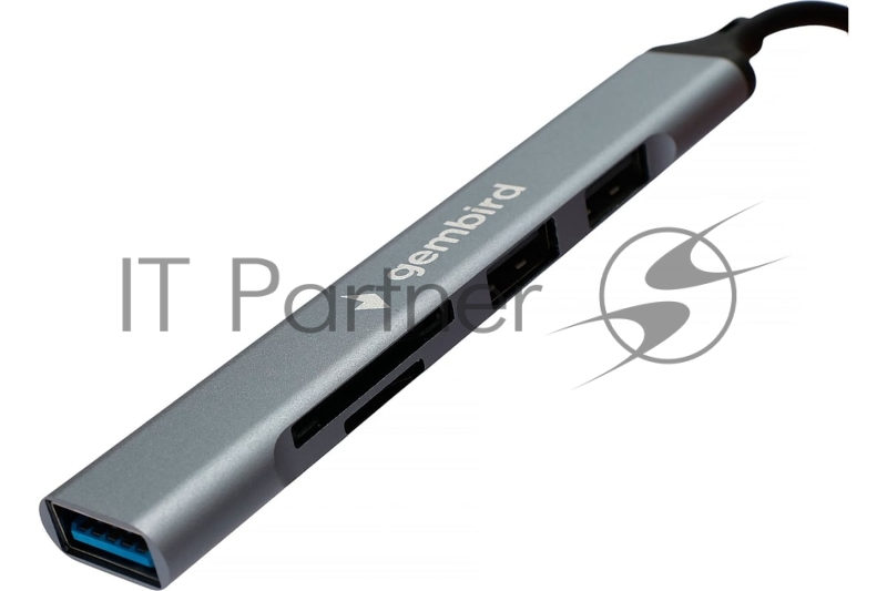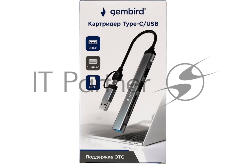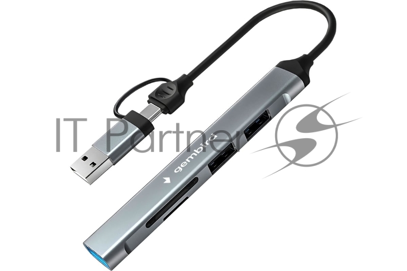 Кард-ридер Type-C/USB-A (3.1) Gembird 5в1: 2xUSB 2.0, USB3.1, SD/TF, кабель 10 см, алюминий