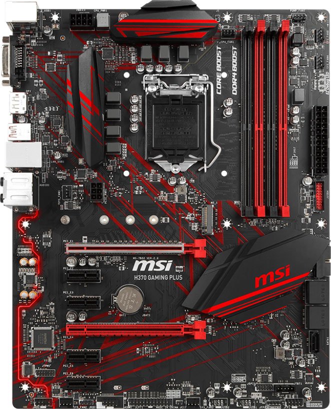 Материнская плата MSI H370 GAMING PLUS Socket 1151v2, Intel H370, 4xDDR-4, 7.1CH, 1000 Мбит/с, USB3.1, USB 3.1 Type-C, DVI, DisplayPort, ATX, Retail