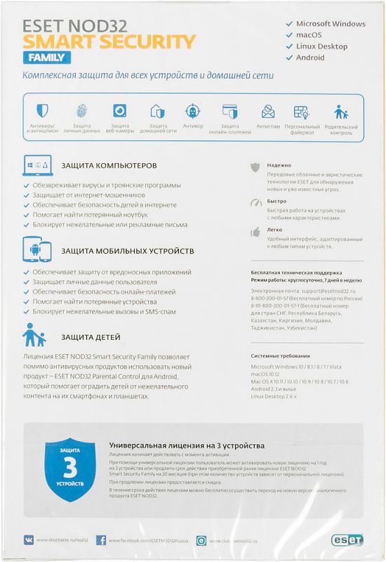 Программное обеспечение NOD32-ESM-1220(BOX)-1-3 ESET NOD32 Smart Security Family - универсальная лицензия на 1 год на 3 устройства или продление на 20 месяцев