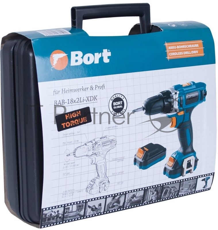 Дрели, Шуруповерты, Гайковерты, Миксеры Bort BAB-18x2Li-XDK Дрель-шуруповерт аккумуляторная 91271501 { 18 В, 1.5 Ач, Li-Ion, 2 Акк, 36 Нм, 1300 об/мин, БЗП, 1,5 кг, кейс, набор аксессуаров 3 шт }