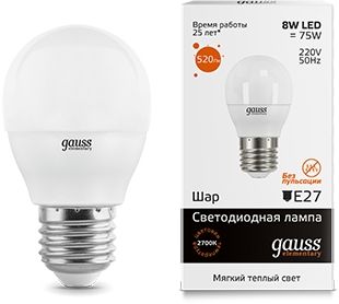 GAUSS Светодиодные лампы GAUSS 53218 Светодиодная лампа LED Elementary Шар 8W E27 520lm 3000K 1/10/100 0
