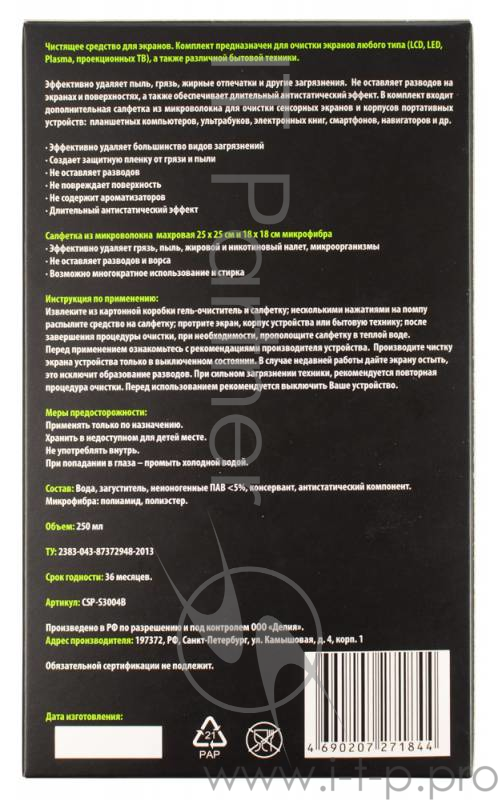 Описание: Чистящее средство-гель для экранов любого типа (LCD, LED, Plasma, Проекционных ТВ), а также различной бытовой техники. Эффективно удаляет пыль, грязь, жирные отпечатки. Не оставляет разводов на экранах и поверхностях, не повреждает поверхность, обеспечивает антистатический эффект.