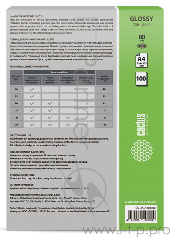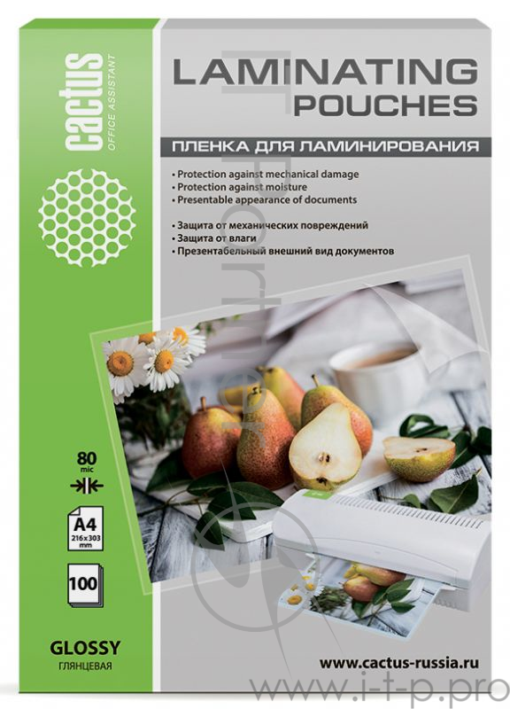 Пленка для ламинирования Cactus 80мкм A4 (100шт) глянцевая 216x303мм CS-LPGA480100