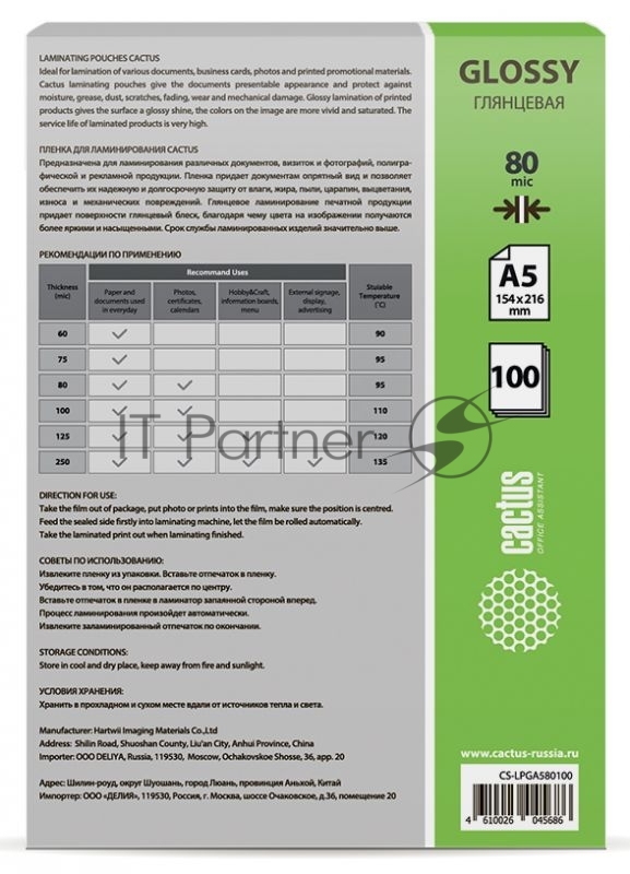 Пленка для ламинирования Cactus 80мкм A5 (100шт) глянцевая 154x216мм CS-LPGA580100