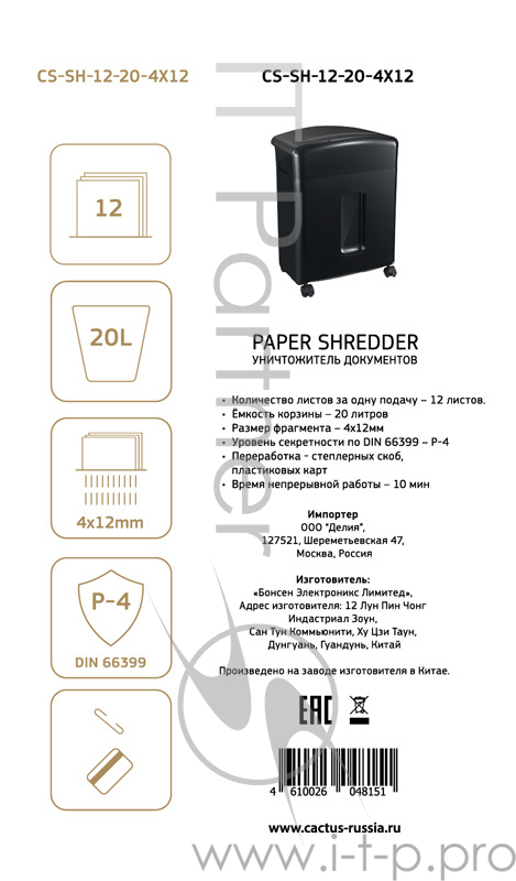 Купить Уничтожитель бумаг Cactus CS-SH-12-20-4X12 в Коврове. Забрать в магазине "Ваш Компьютер" г. Ковров пр-т Ленина 20