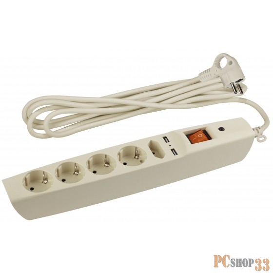 ЭРА Удлинители бытовые, Сетевые фильтры ЭРА C0043328 Сетевой фильтр SFU-5es-2m-I бежевый {3x1 мм2, со шт, с выкл, 5гн + 2 USB - зарядки, 2м, защита от короткого замыкания, от перегрузки, от импульсных и высокочастнотных помех}