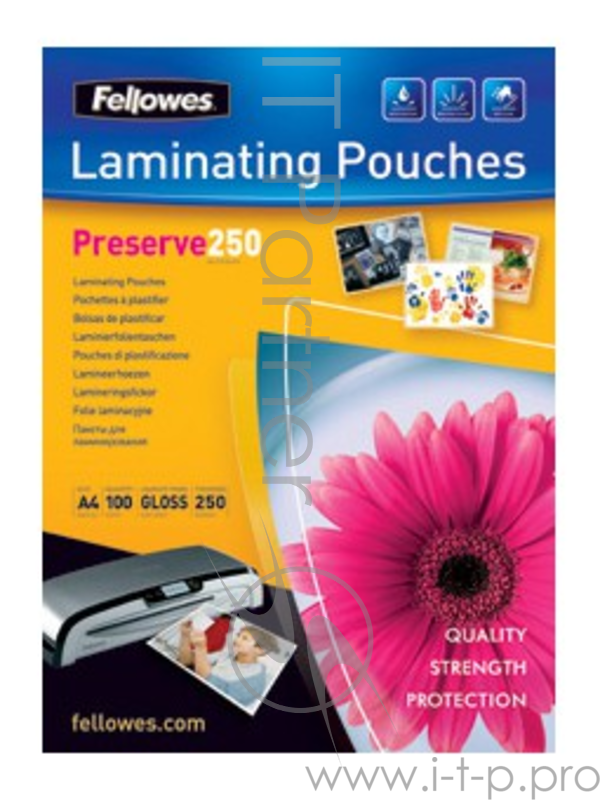 Пленки для ламинирования Fellowes®, A4, глянцевая, 250 мкм, 100 шт, трехслойная структура: ПВХ + ПЭТ