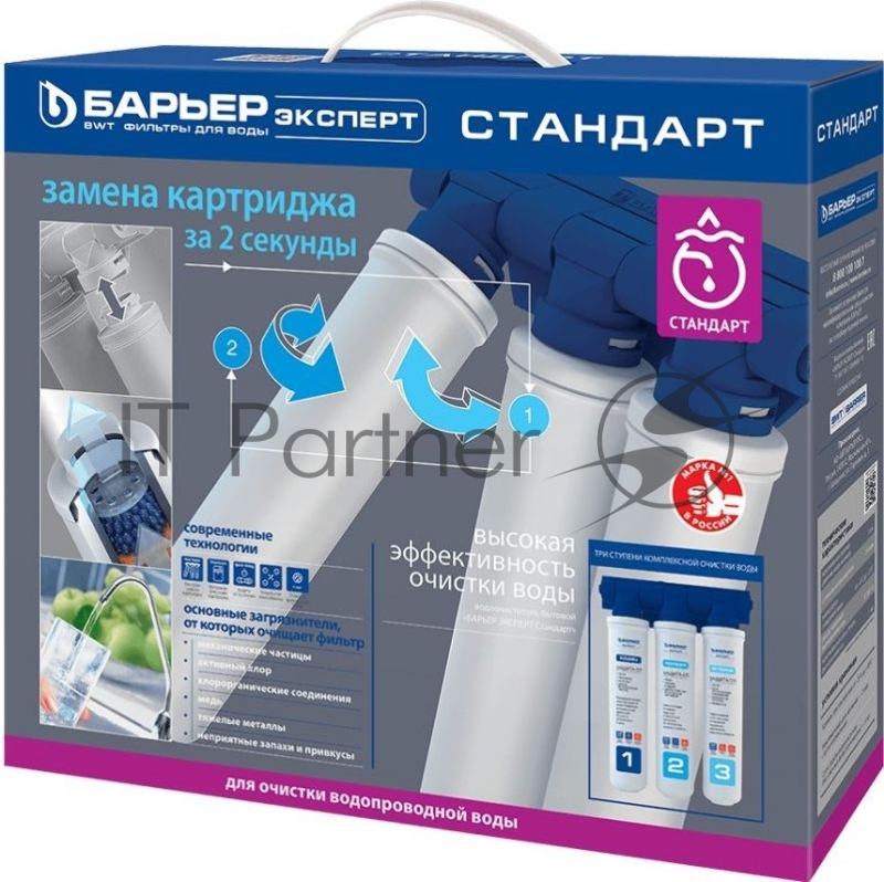 Описание: Комплексная очистка водопроводной воды от всех основных содержащихся в ней вредных примесей. Быстрая замена картриджей без специальных инструментов. Для холодной воды.
