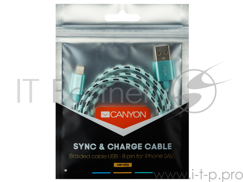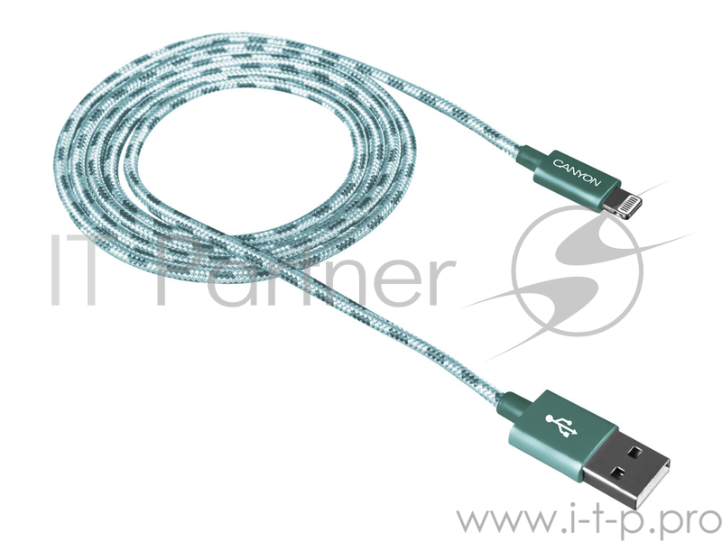 Кабель Lightning/USB, braided, metallic shell, cable length 1m, Green CANYON CNE-CFI3G