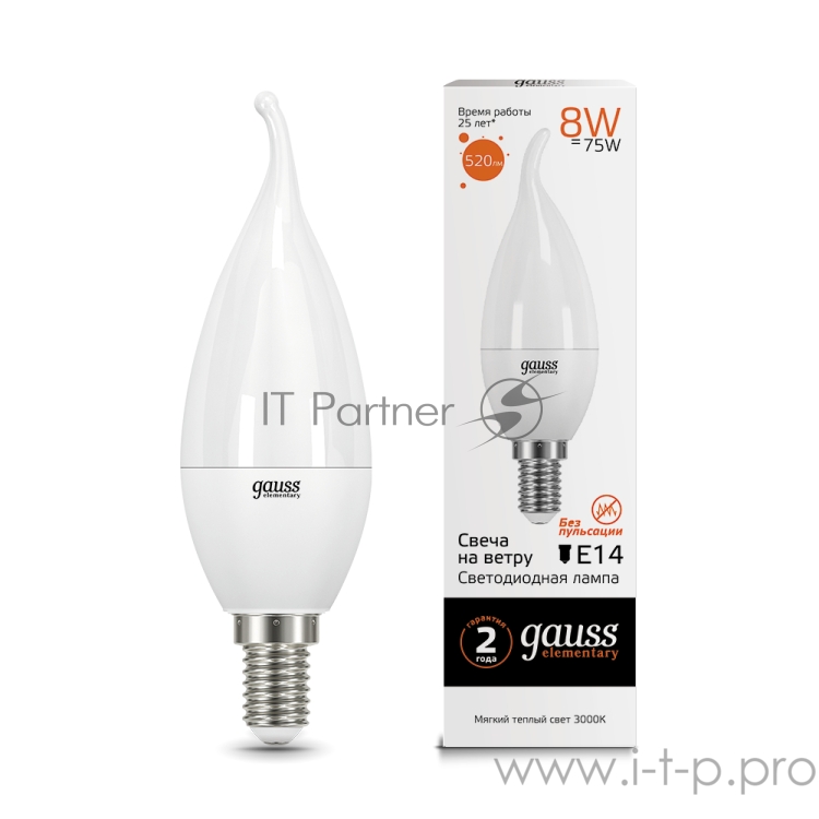 GAUSS Светодиодные лампы GAUSS 34118 Светодиодная лампа LED Elementary Свеча на ветру 8W E14 520lm 3000K 1/10/50 0