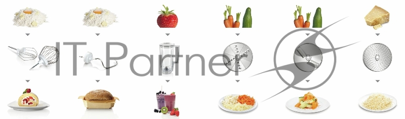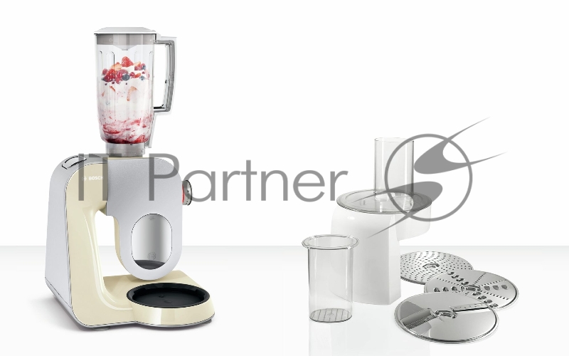 Другие насадки: Венчик для взбивания, венчик для смешивания, насадка для замешивания теста) и долговечный измельчитель с тремя дисками для разных типов измельчения: измельчения, шинковки и нарезки и блендер.